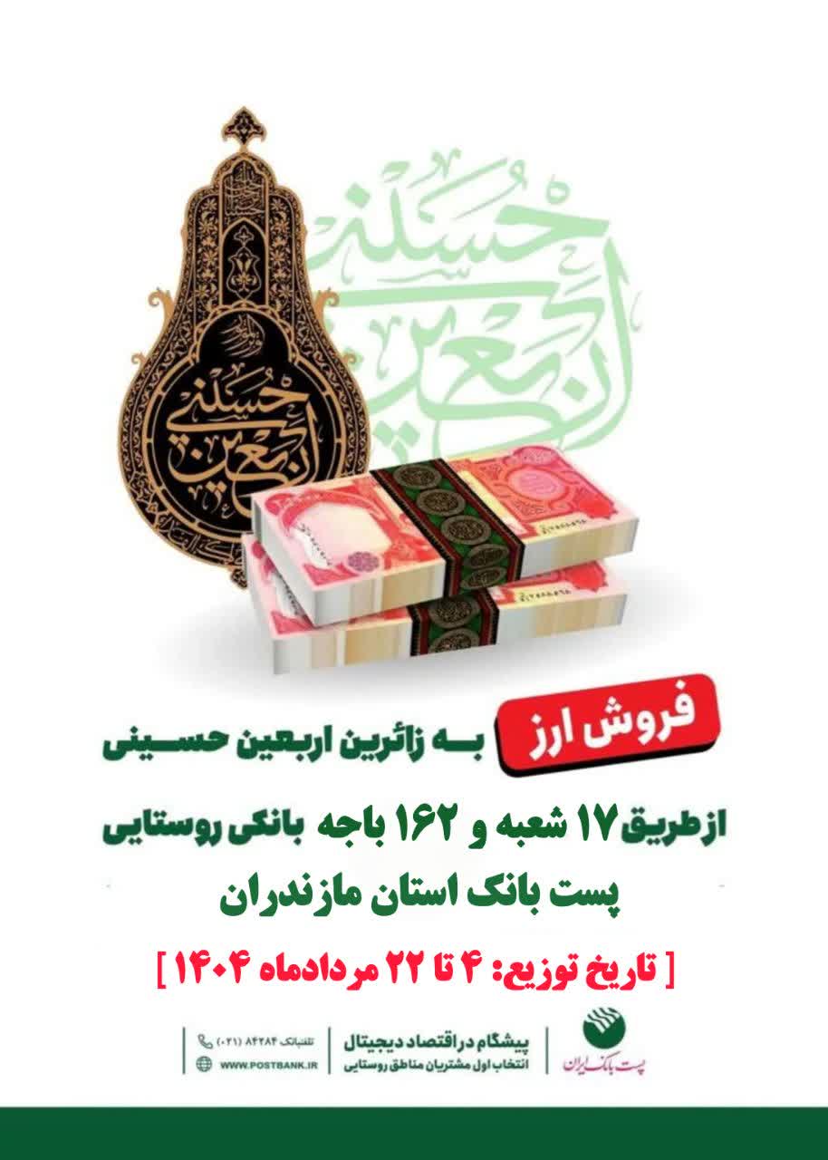 گفتنی است بر اساس اعلام روابط عمومی پست بانک استان مازندران، توزیع ارز اربعین در ۱۷ شعبه شهری و ۱۶۲ باجه روستایی در سراسر استان مازندران از تاریخ ۴ تا ۲۲ مردادماه ۱۴۰۴ انجام می شود.
