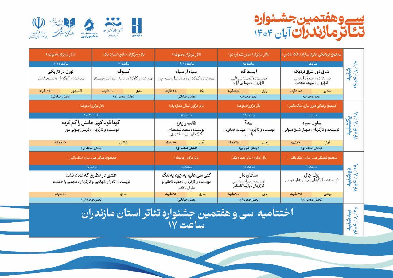 گفتنی است سیوهفتمین جشنواره تئاتر استان مازندران از هفدهم تا بیستم آبانماه جاری به دبیری امیرحسین (ایمان) فلاحتپیشه اجرا و آیین اختتامیه آن سهشنبه ۲۰ آبان ۱۴۰۴ در تالار مرکزی ساری برگزار میشود.